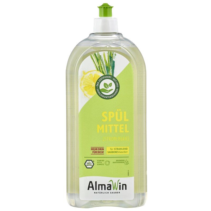 Das Spülmittel Zitronengras von AlmaWin ist frei von Mikroplastik, Phosphaten und anderen Inhaltsstoffen, die die Gewässer belasten. Dadurch ist das Spülmittel besonders umweltschonend. Die Verpackung besteht aus recycelten Material, FSC-zertifizierten Kartonagen und alternativen Verpackungen wie Graskartons.