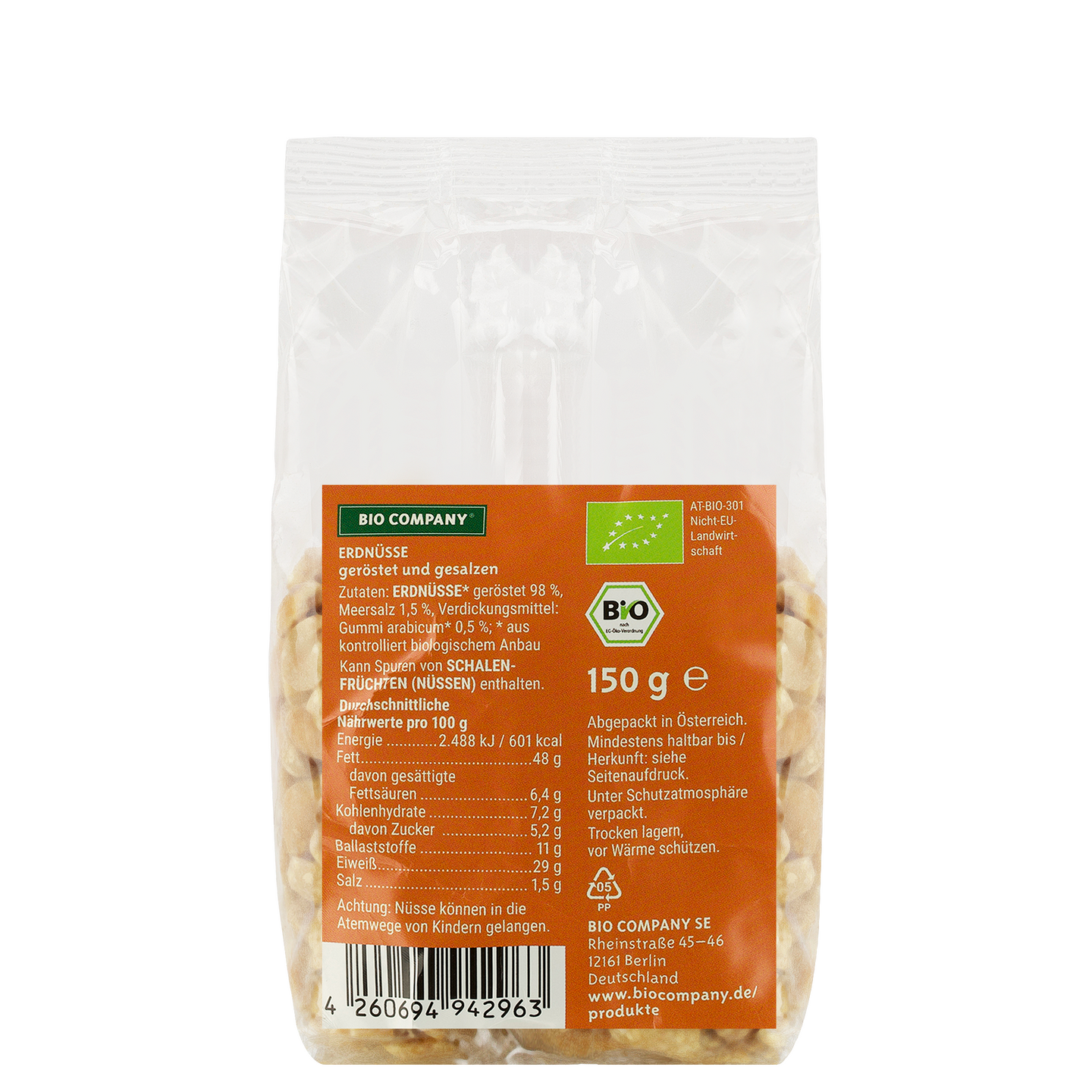 ERDNÜSSE* geröstet 98,5 %, Meersalz 1 %, Überzugmittel: Gummi Arabicum* 0,5 %