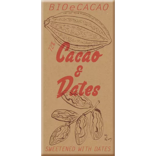 Die süße BIO-Schokolade mit Datteln von BIOeCacao ist eine handwerkliche Kreation aus der Schweiz, die die Intensität des 72%igen Kakaos und die natürliche Süße der 28%igen Datteln harmonisch miteinander verbindet.