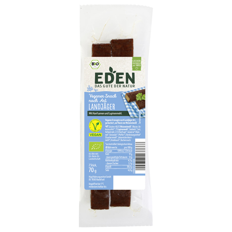 Der vegane Snack nach Landjäger-Art von EDEN überzeugt mit seinem herzhaften Geschmack und ist die perfekte Alternative für alle, die auf Fleisch verzichten möchten, dabei aber nicht auf deftig-würzige Aromen verzichten wollen. Auf Basis von Weizeneiweiß und mit hochwertigen Zutaten wie Hanfsamen und Lupinenmehl hergestellt, liefert der Snack eine gute Portion pflanzliches Eiweiß und schmeckt dabei angenehm rauchig und intensiv.