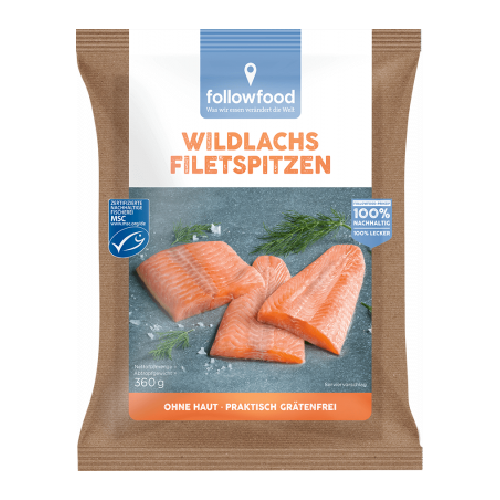 In unsere Wildlachs Filetspitzen kommt der Buckellacks (Oncorhynchus gorbuscha) und Ketalachs (Oncorhynchus keta). Diese werden im Nordwest- und Nordostpazifik gefischt. Dort leben sie anadrom, was bedeutet, dass sie zwar in Süßgewässern wie Flüssen schlüpfen, aber den Großteil ihres Lebens im Ozean verbringen. Dort legen sie große Entfernungen zurück, wodurch ihr Fleisch sehr fest mit einer zarten Fettfaserung ist. Zur Fortpflanzung kehren sie dann wieder zu ihrem Geburtsort zurück. In dieser Zeit entwickeln männliche Lachse den sogenannten Laichhaken, eine Vergrößerung des Kiefers, und einen Buckel zwischen Kopf und Rückenflosse, der beim Buckellachs sogar so stark ausgeprägt ist, dass er namensgebend ist.