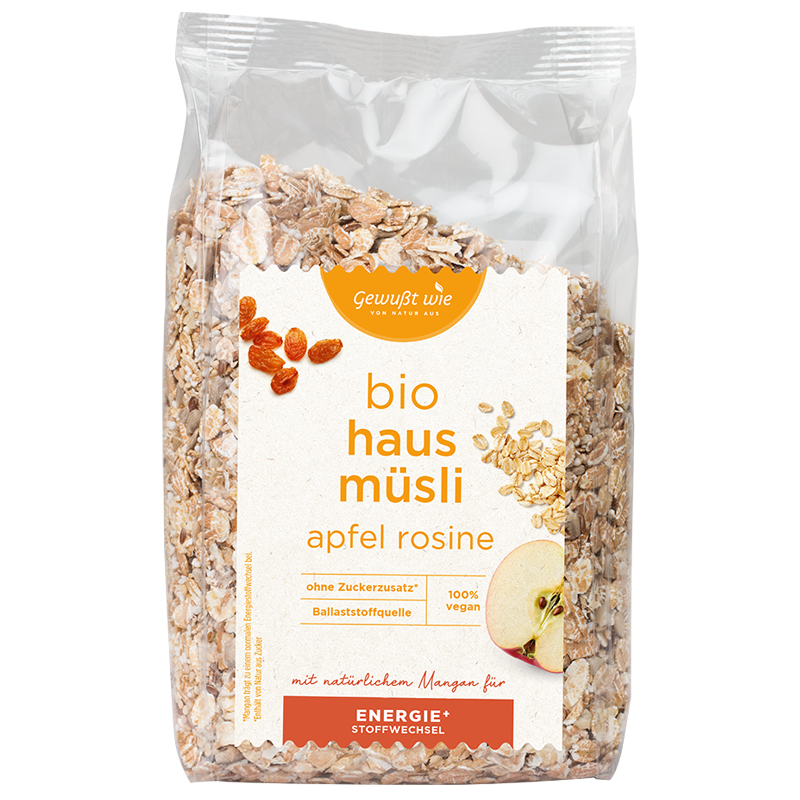 | Inhaltsstoffe | 29% HAFERflocken*, 20% WEIZENflocken*, 15% DINKELflocken*, 15% Sultaninen geölt* (Sultaninen*, Sonnenblumenöl*), 12% Apfelwürfel getrocknet*, 6% GERSTENflocken*, 2% Sonnenblumenkerne*, 1% MANDELN gehackt und geröstet* |