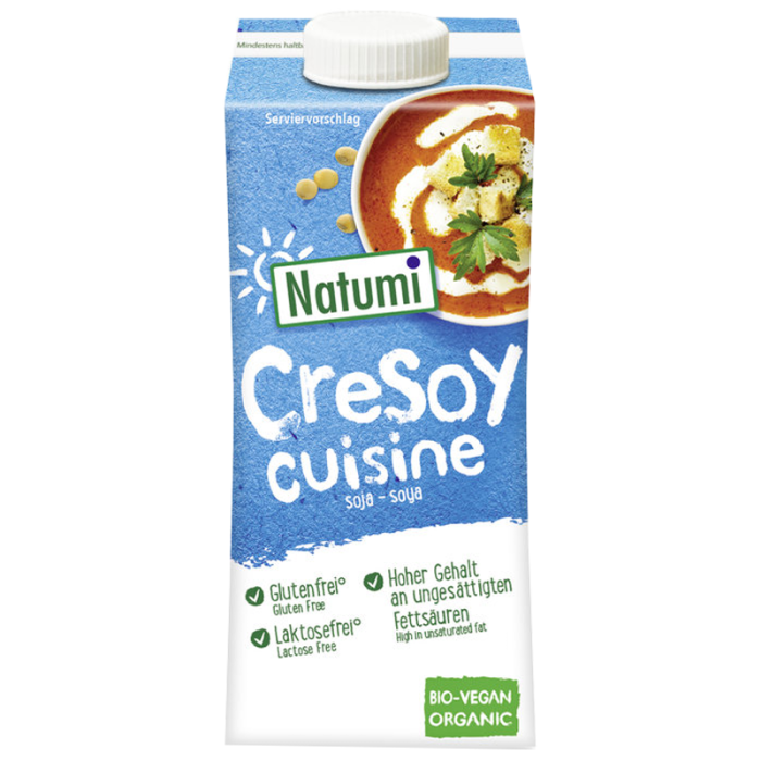 | Verwendungs-/Anwendungshinweis | Eignet sich hervorragend zur Verfeinerung von Dips, Saucen, Suppen, Aufläufen, Süßspeisen oder Gebäck. Gut gekühlt und unter Zugabe von Sahnestandmittel lässt sich CreSoy wie Schlagobers bzw. Sahne aufschlagen. |