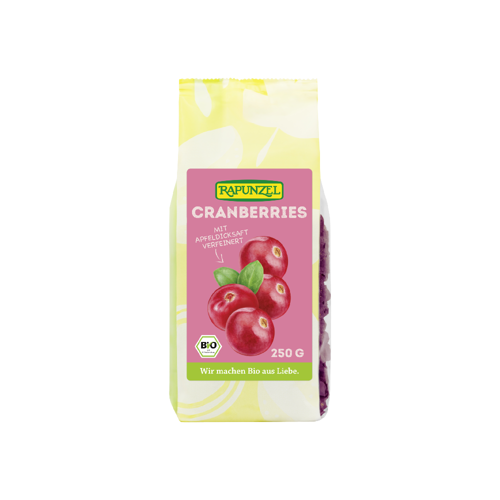 Die Rapunzel Cranberries stammen aus traditionellen Anbaugebieten in Kanada. Sie werden mit Apfeldicksaft verfeinert, so wird die starke Säure milder. Es entfaltet sich ein fein-fruchtiges, leicht herbes Aroma mit einer angenehmen süß-säuerlichen Note. Als ganze Beeren sind sie besonders saftig.