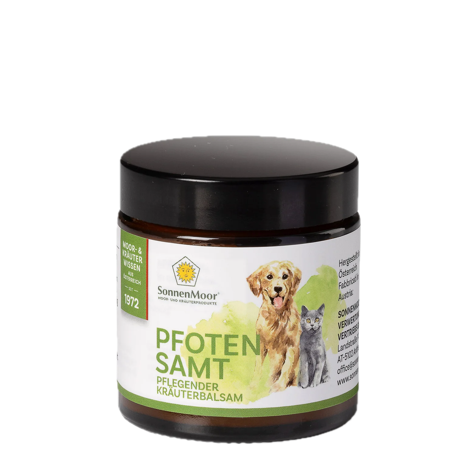 Pfotensamt für die Pfotenpflege von Hunde und Katzen und zur Pflege der Haut – ein Naturprodukt des österreichischen Familienunternehmens SonnenMoor, tätig seit 1972. Dieses Tierprodukt enthält die Kraft von fünf ausgewählten Kräutern in überwiegender Arzneibuchqualität wie Blutwurz, Ringelblumenblüten und Kamillenblüten und vielen anderen. Während uns die Füße durchs Leben tragen, werden unsere Hunde und Katzen von ihren Pfoten durchs Leben getragen – mit einem Unterschied: Die Pfoten unserer Lieblinge sind in der Regel viel mehr beansprucht. Genau aus diesem Grund gibt es den SonnenMoor PfotenSamt (Pfotenpflege für Hunde) für samtige Tierpfoten – unschlagbar als Pfotenbalsam im Winter zum Schutz vor der Kälte, aber auch im Sommer als Hitzeschutz. Verletzungen durch Splitt, Streusalz, Kälte oder raue Untergründe sind mit unserer Creme für Hundepfoten Schnee von gestern – dafür sorgen Wollwachs und Bienenwachs gemeinsam, die sich wie ein schützender Film um die Pfote legen. Ob die im Winter strapazierten Schnauzen und Hautfalten oder die beanspruchte, trockene Haut und auch bei Sonnenbrand und kleinen Wunden, mit dem Pfotensamt Balsam ist Ihr Vierbeiner rund ums Jahr bestens versorgt.