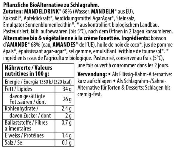 Wie klassischer Schlagsahne direkt aus dem Kühlschrank mit dem Schneebesen kurz aufschlagen. Eignet sich als Sahneersatz für Torten, Desserts und zur Dekoration von Speisen.