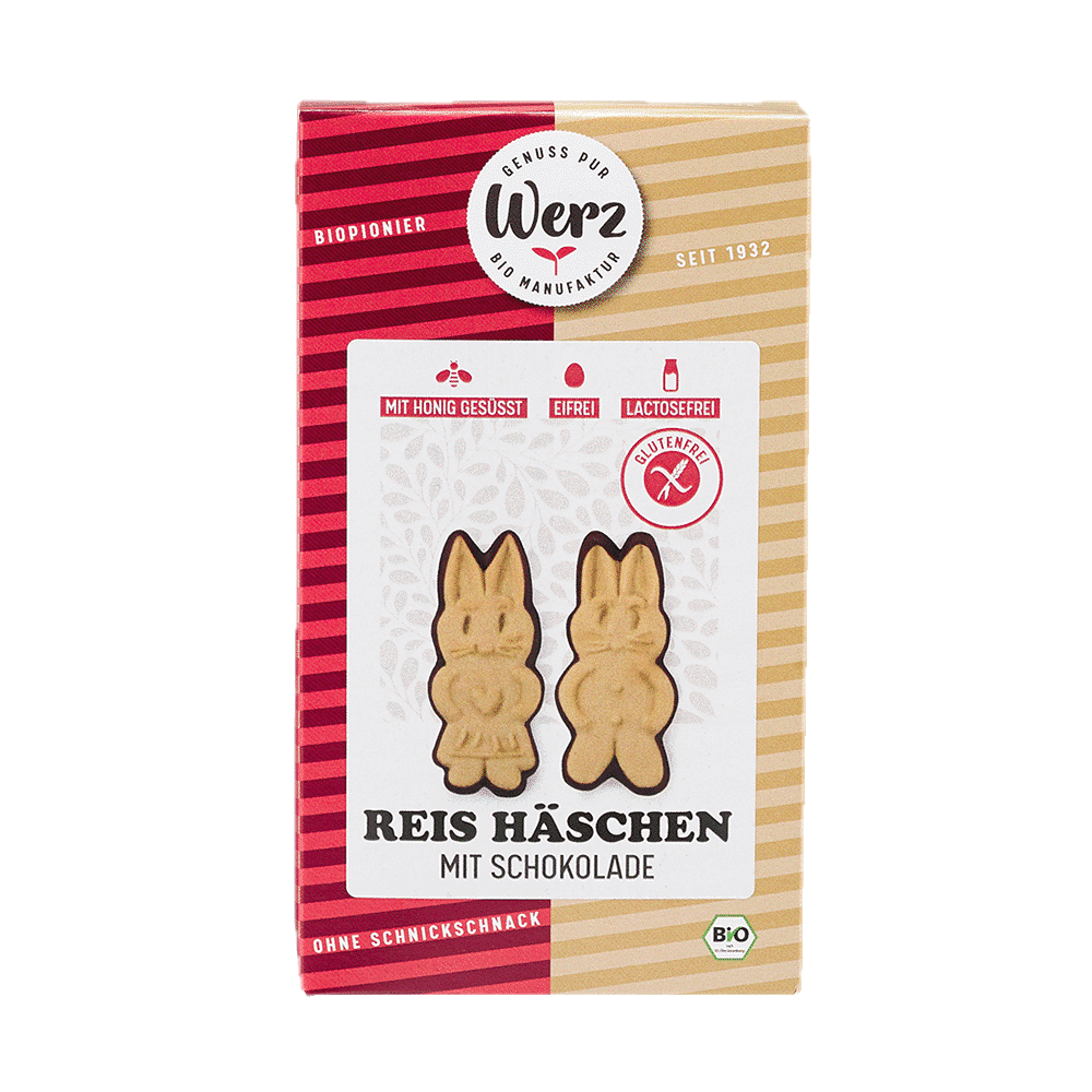 Dieses Vollkorngebäck kommt ganz ohne Industriezucker aus. Für die angenehme Süße sorgen stattdessen Honig und Reissiruppulver aus kontrolliert biologischem Anbau. Die Reis-Häschen sind wunderbar knusprig und mit einer köstlichen Schokoladenglasur überzogen.